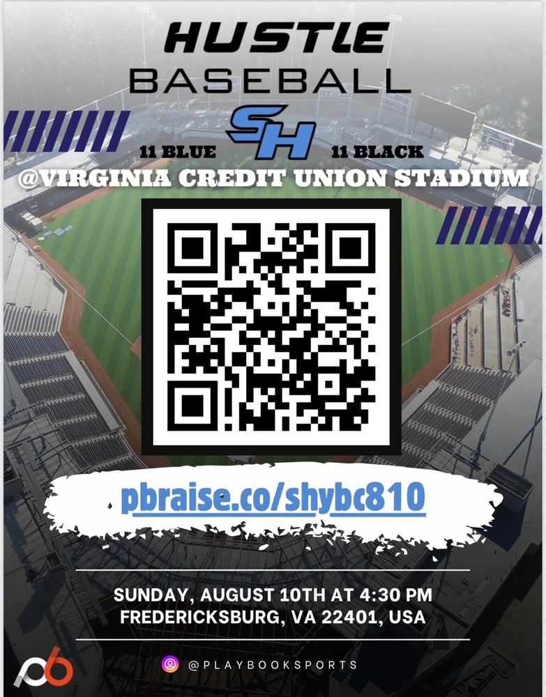 Game 1 will begin at 3pm as Hustle 10U will take on a team to be named, then at 4:30pm Hustle 11U Black will take on Hustle 11U Blue in game 2. Concessions will be open during the game and anyone interested in attending the game please scan the barcode below or visit pbraise.co/shybc810